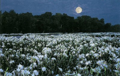 160 acres of Spider Lily's at Langford Shoals, South Carolina, one of the largest stands in the southeast, under a full moon.